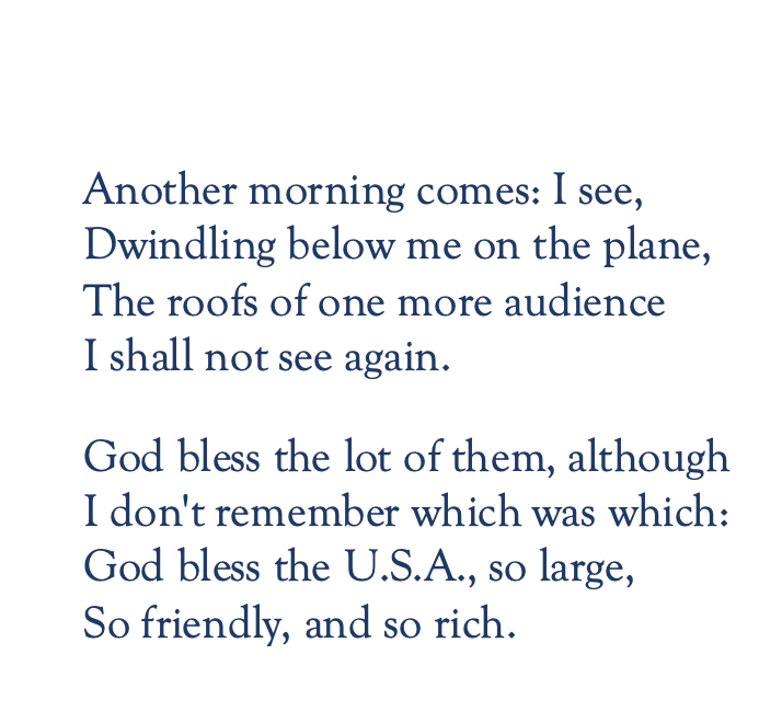 In 1939, perhaps in response to the events of September 1st, Auden moved to America. His English contemporaries including the rest of the “Pylon School,” may have felt a bit betrayed, but the immigration did not affect his poetic sensibilities. He continued to make references to England, and his work retained its distinctly cosmopolitan themes and messages. The Age of Anxiety (1948), for which he won the Pulitzer Prize, manages to convey a generally “modern” condition in and through the conversation of four unlikely compatriots in a New York City bar. Like the one established poet who would hail The Age of Anxiety as Auden’s best work to date, T.S. Eliot, Auden eschewed the idea of a strict national identity, fashioning himself as a citizen of the world. Even though some critics are fond of speaking of an “English,” “American” and even “Austrian” Auden, the author is best understood as an English language writer whose rootlessness or multiple connections (depending on your point of view) fueled his creativity.