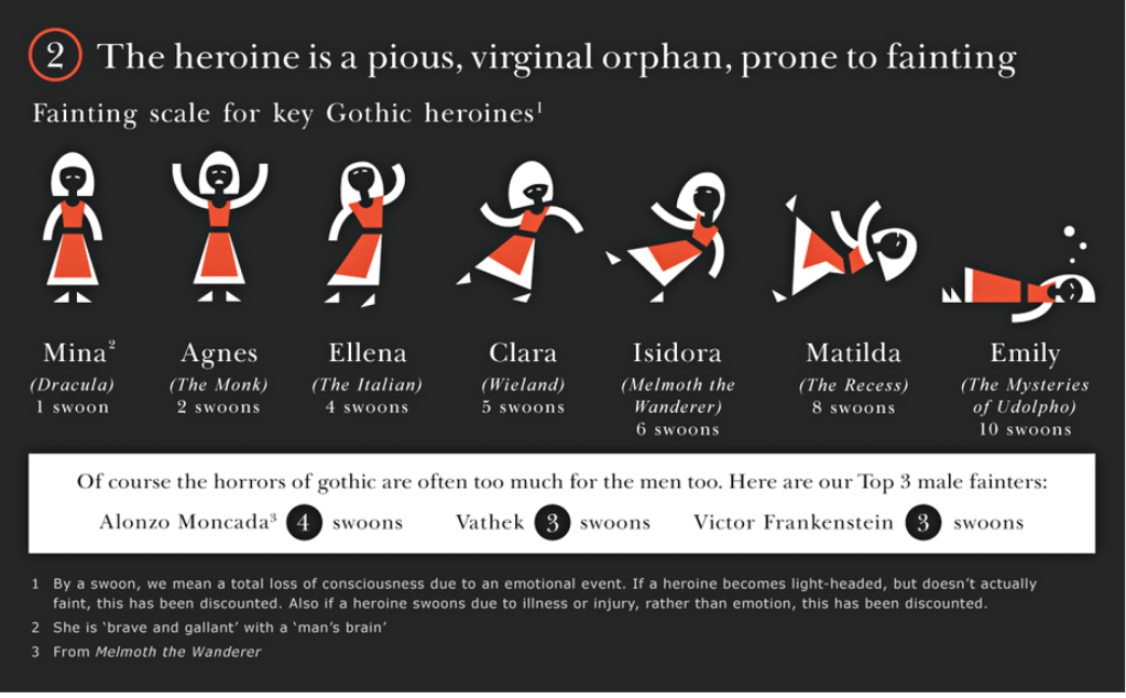 I highly recommend The Guardian‘s “How to tell you’re reading a gothic novel, in pictures.” #2 (pictured) illustrates why Jane Austen only ever produced a clever parody of the Gothic. A true Austen heroine may “run mad as often as [she] choose[s],” but she should never, ever faint.