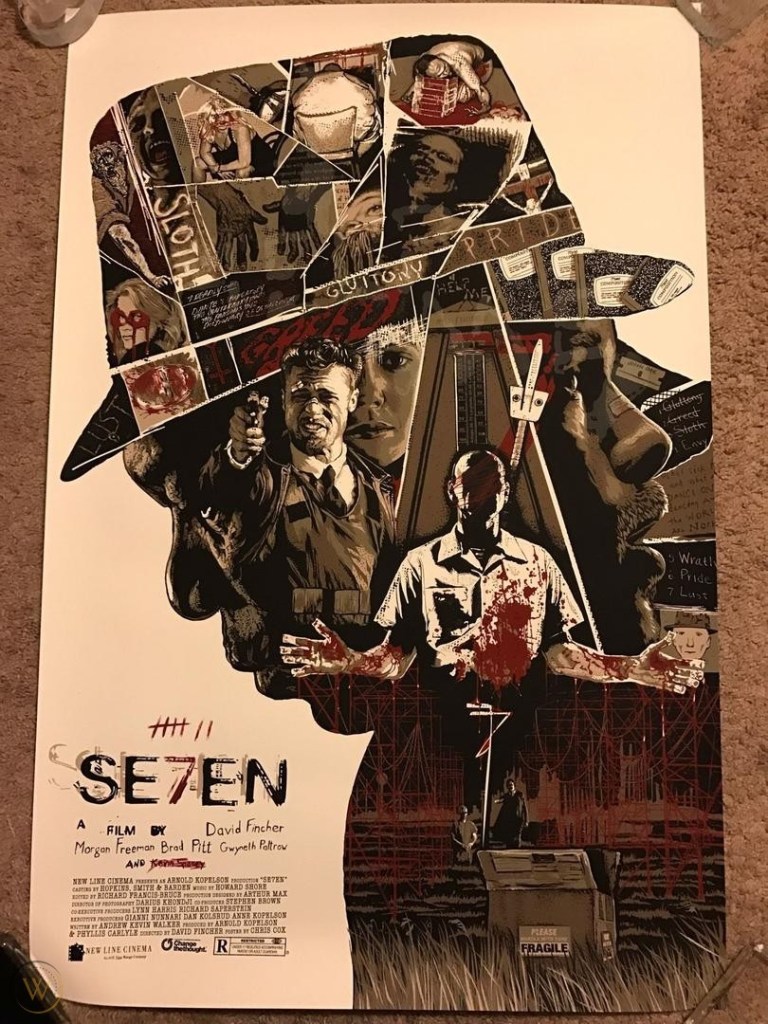 A series of match cuts also aid in continuity. Numerous eye-line matches establish that various shots that may appear unrelated (crime scene photos, book spines, Gustav Doré’s illustrations for the Inferno) are actually images that our central characters are viewing. These matches also aid in spatial continuity, as we implicitly understand where the viewed image or subject is in relation to the subject that is viewing. This is as true of Mills looking at crime scene photos as it is of Somerset looking up at the guards in the library (and, it should be said, of the main guard looking down on Somerset).