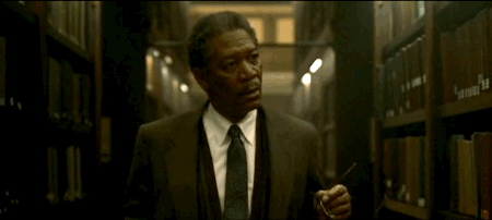 Even if we don’t know that Morgan Freeman plays a world-weary detective named Somerset, and that Brad Pitt plays his idealistic partner, Mills, we understand where the characters are, and how they relate to one another, because the clip relies on continuity editing. We may not get an establishing shot that shows us the exterior of the library, but we know, from dialogue and décor, where Somerset is, and the mobile camera, which tracks Somerset as he enters the building, effectively moves us through the location, first by following Morgan Freeman’s character, then by following the guard who walks up the steps. Angles alternate between high and low (notice how our initial shot of Somerset shows him from an aerial or bird’s eye view, whereas subsequent shots are positioned at a low or slightly below eye-level angle), but we always understand where he is in the library, and how this position relates to that of the guards up above, because the camera does not violate the 180-degree rule.